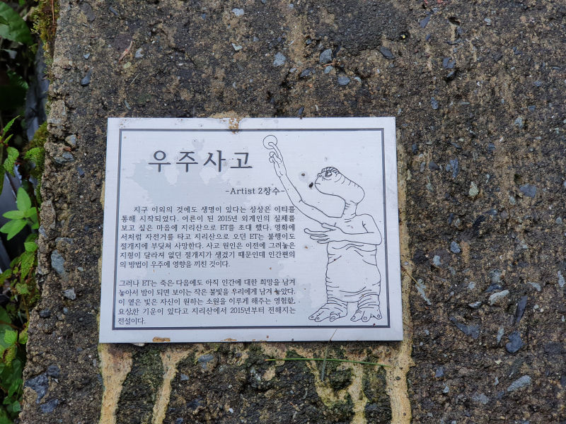 누가 이런 생각을 해낸 걸까. 예술가 2창수. 이름도 특이하다. 아직 낮에는 한여름과 별반 다르지 않은 9월 초, 땀에 전 몸으로 걷다 부서진 자전거 앞에 서서 한참을 생각하고 웃고 궁리한다. 이게 뭐라고. 2창수란 ‘Artist’도 궁금하고, 왜 하필 외계인 E.T이며, 넓디넓은 지구별중 지리산일까.