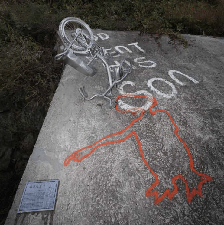 지리산둘레길 위태-하동호 구간 중간 조금 지난 곳이다(경남 하동군 옥종면 양이터재). 콘크리트로 포장한 임도 내리막길 한쪽에 부서진 자전거가 쓰러져 있다. “누가 이런 데 자전거를 버렸나.” 혼잣말했는데 바닥에 금속 푯말이 붙어 있다.